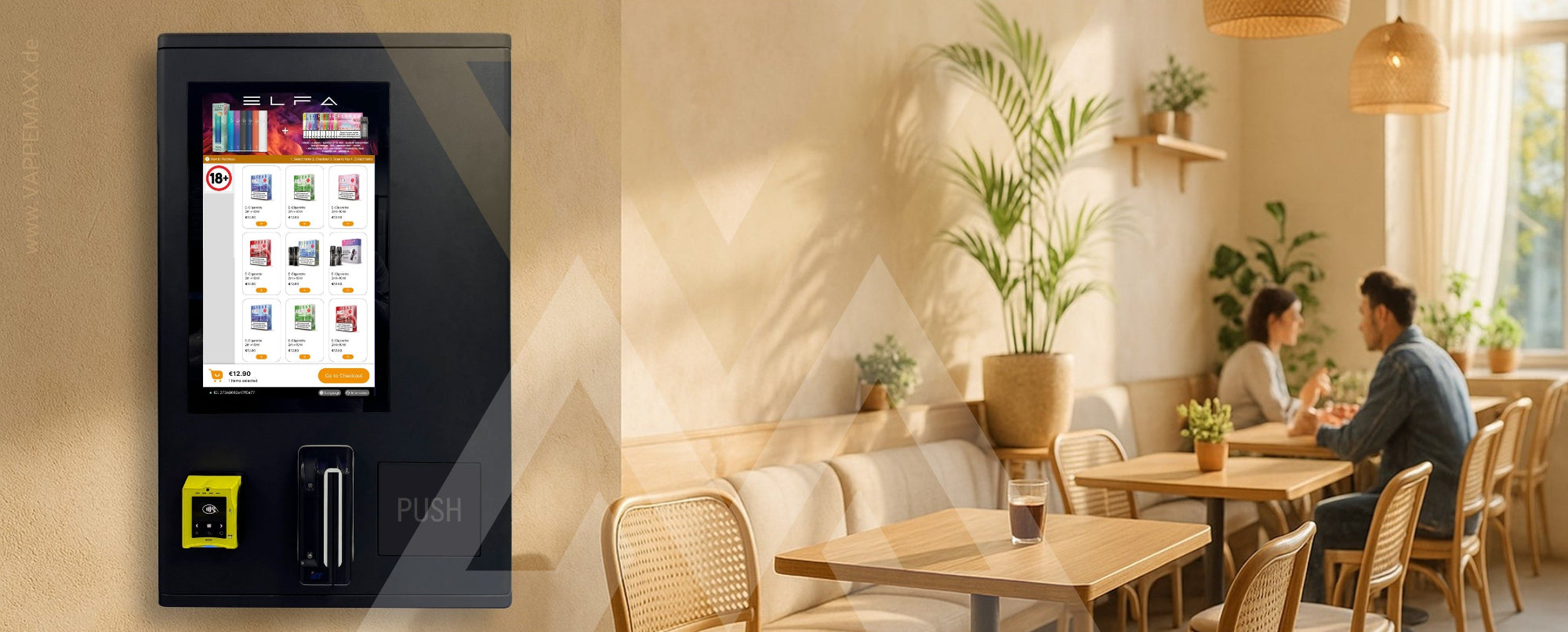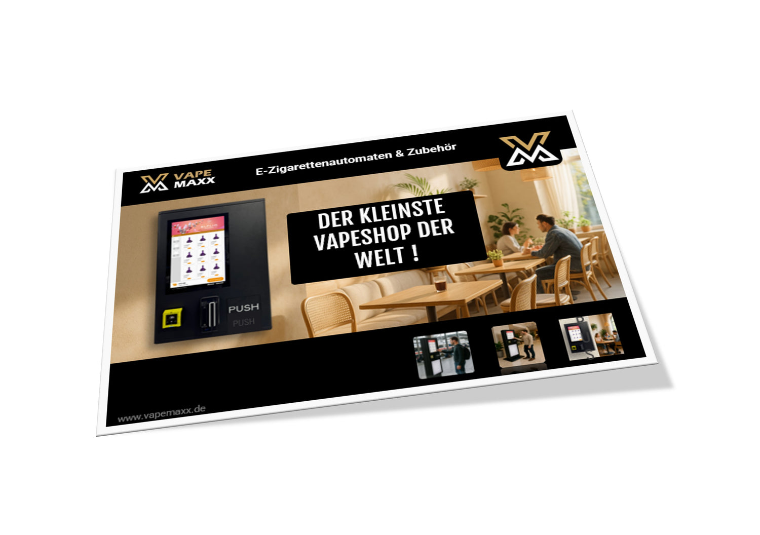 mehr InformationenOb Kino, Spielhalle oder Bowlingcenter – mit dem Vapemaxx - Vapeautomaten bietest du deinen Gästen ein modernes Extra und verdienst ganz nebenbei. Einmal kaufen, aufstellen, loslegen – so einfach holst du dir zusätzlichen Umsatz in deine Kasse